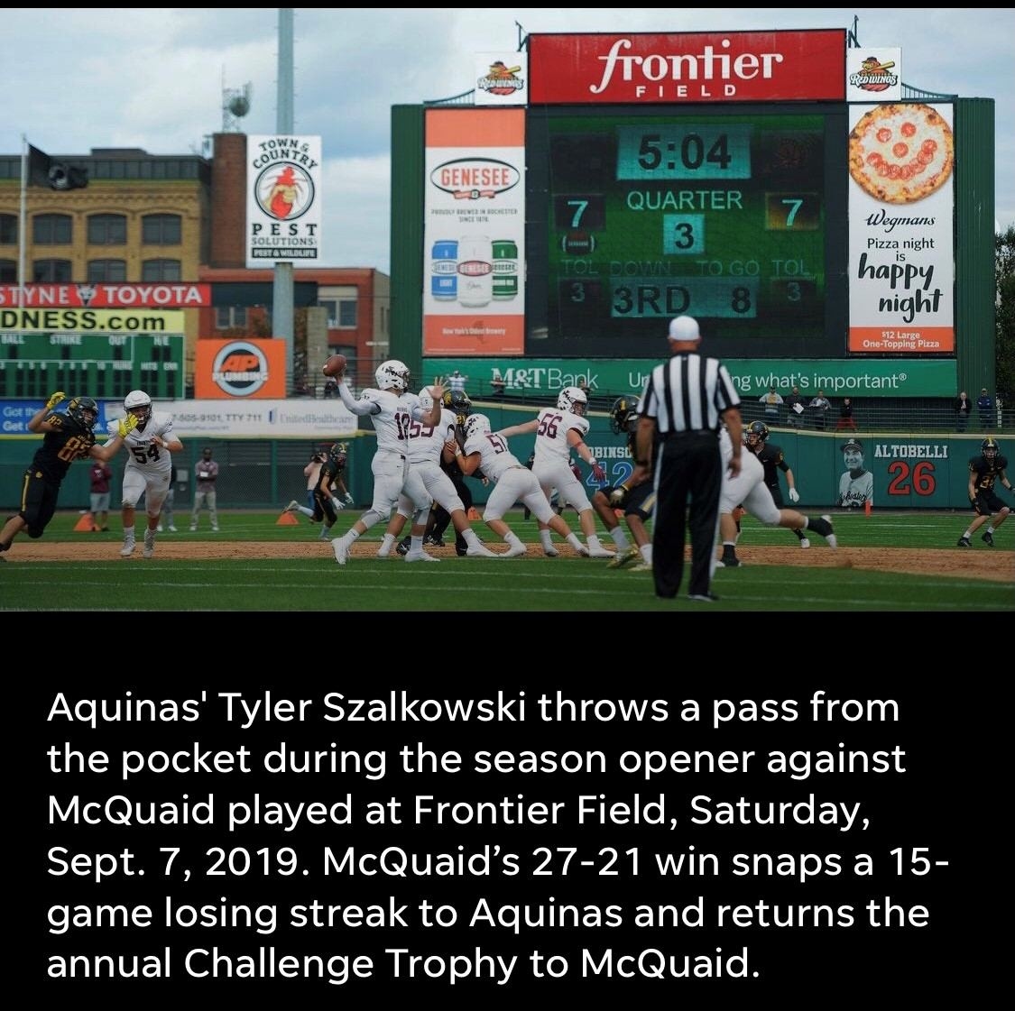 In 1964, Al '43 and Lucie Joseph donated this trophy to be given to the winner of the annual Aquinas-McQuaid football game. The trophy was to honor a priest who made a difference in Al's life while attending Aquinas Institiute. The trophy is a symbol of one's man belief in tradition and excellence and the true value of a Catholic education. A value that Al and Lucie took seriously as they sent all four boys to Aquinas and all four girls to Nazareth. The trophy has become a yearly tradition honoring two Catholic high schools and the values they embody. At the end of each game, coaches from each team pick an MVP. These players receive the Joseph Award in memory of Al and Lucie Joseph.