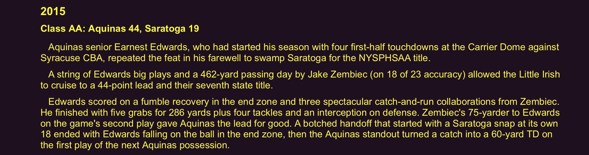 MVP Earnest Edwards caught five passes for 286 yards and scored four touchdowns to help Aquinas win their 7th state title.