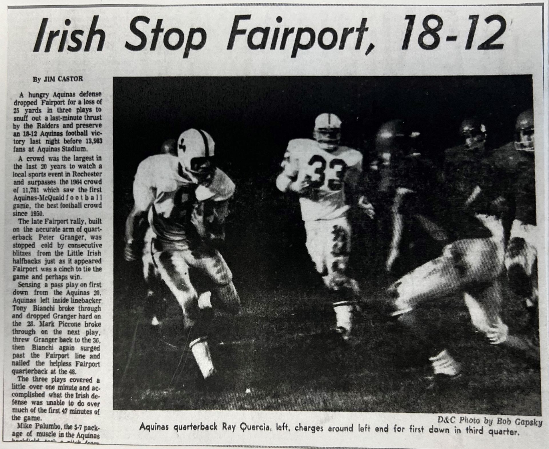 In 1970 Aquinas finsihed 7-1, with victories over Fairport and Newark but lost to Mt Pleasant of Schnectady. Rush Henrietta finsihed 8-0 and was voted number one, while Aquinas finished number two in the coaches poll. Again it would have been great to see these two teams collide to determine a true champion, instead of basing it on coaches votes.