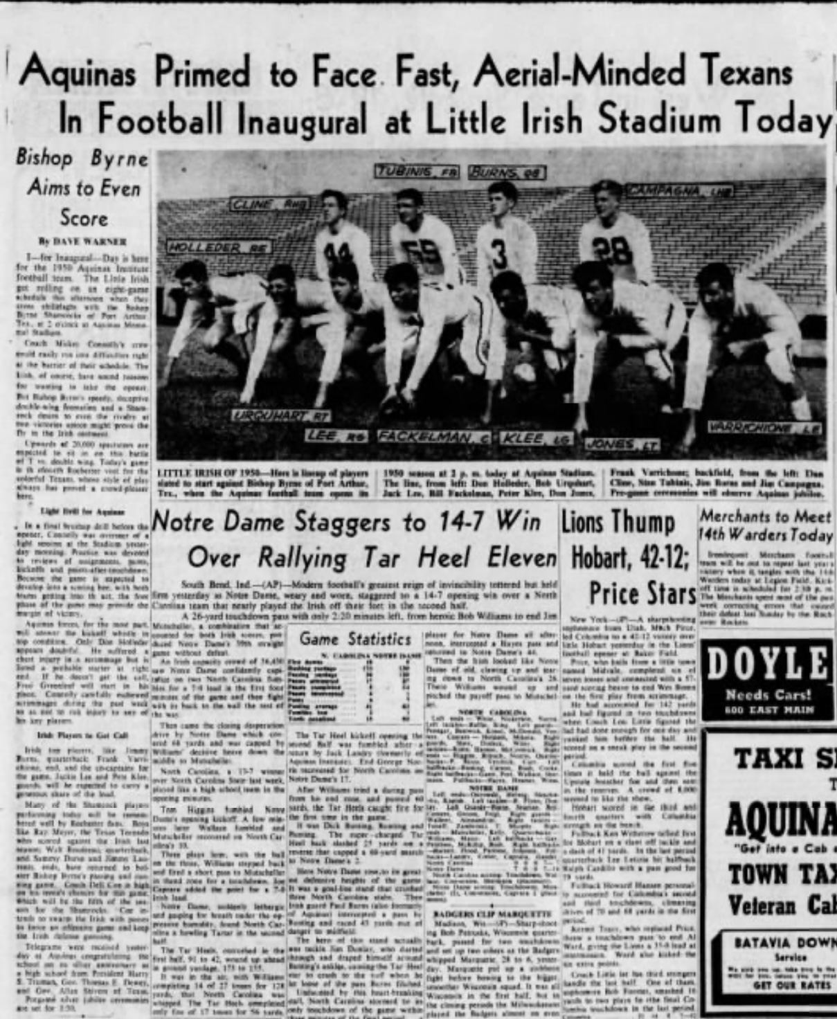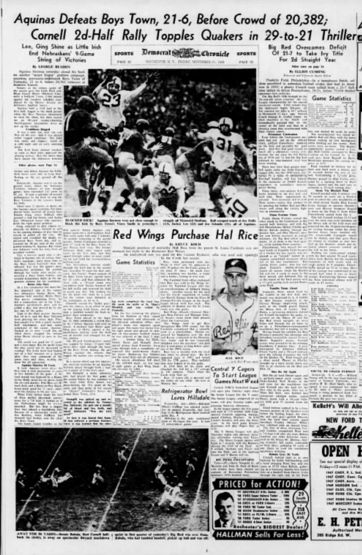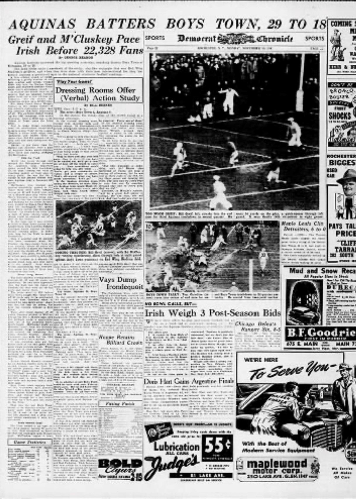 Big-time football had truly arrived in Rochester. Nationally acclaimed sports columnist Jimmy Powers of the New York Daily News called Rochester, "one of the hottest prep football towns in the country." Or put another way by Elliot Cushing of the Rochester Democrat and Chronicle, "Aquinas football has reached the big-business stage. It has mushroomed from obscure corner store to a tinseled supermarket." Games regularly drew more than 20,000 fans and one game, Thanksgiving Day, 1948 drew more than 23,000.