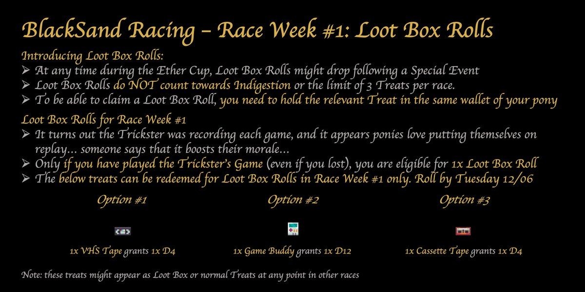 At any time during the Ether Cup, Loot Box Rolls might drop following a Special Event. Here is an example of the Loot Boxes happenend during during Week #1. Please, visit each Race Week page for official information on specific drops