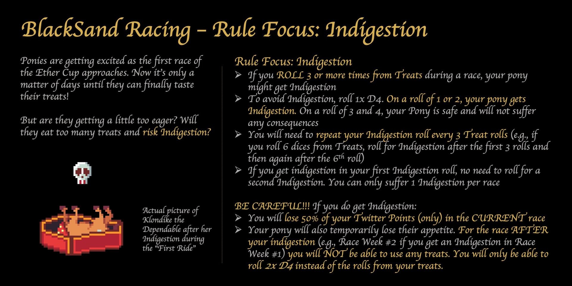 Note: Indigestion can happen when you ROLL 3 or more times, not when you feed 3 treats (e.g.; if you feed 1 Eggplant = 1x D4 and 1 Carrot = 2x D6, you only use 2 Treats, but you Roll 3 Treat Rolls. Thus, check for Indigestion