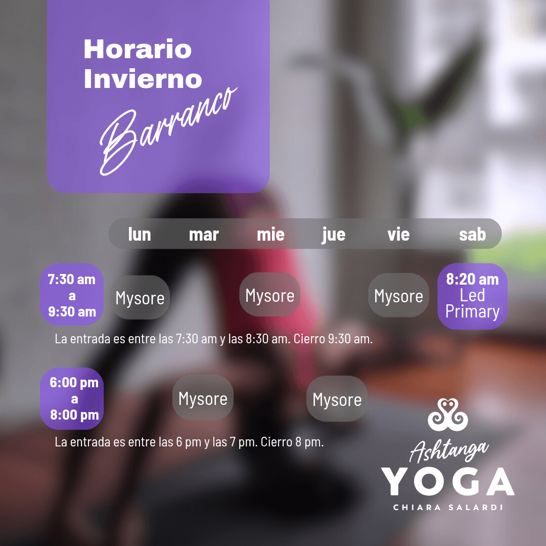 Los lunes, miércoles y viernes la entrada es desde las 7:30 am hasta las 8:30 am, el shala cierra a las 9:30 am.