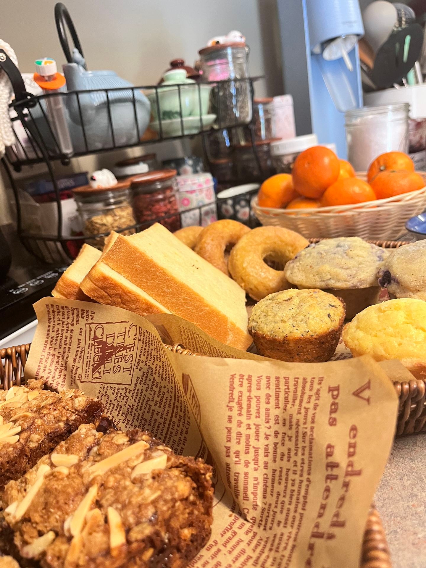 I know I tend to use this website as a bit of a form of therapy. An outlet to vent things I don't feel comfortable speaking about. But in retrospect, it might seem as if I were angstier than I am daily. I mean, I am sensitive. I do get angsty and prone to depressive episodes. I cry more than I should as I read books and watch movies. But I am human and I do feel that only writing about one part of me is a bit misrepresentation of me as a person. So I decided to write a slice-of-life post. Especially since I gained some energy back this weekend. I've been very tired for a long time. I think I was burned out from the pressure of an interstate move, obligations, sleep deprivation, etc. And even on Saturday, I woke up unmotivated. But I eventually got up and started my baking for Easter Sunday. I am not religious and I'm pretty low-key in general about holidays, but my family are huge fans of all the holidays, and I figured that I could make a nice Sunday brunch as a treat to celebrate. Boy, did I bake! I do not know what got into me, but I made: 2 types of muffins, baked doughnuts, jammy bars, and 2 types of bread. My mother-in-law might be slightly addicted to jammy bars now, which made me happy. I also made and froze some sofrito and made a yummy dinner. I was so happy I didn't run out of spoons (I wrote another post on that). I even felt enough energy after doing all those things to play some Stardew Valley (I HAD to start a game after the 1.6 update dropped), read a little, and work on knitting some socks. I had a peace I hadn't known in a long time and it was refreshing to feel ok instead of exhausted, for once. I also felt the silly joy of having a mini bakery basket full of goodies. It was just... incredibly hygge! I'll add a photo below of the basket of goodies.