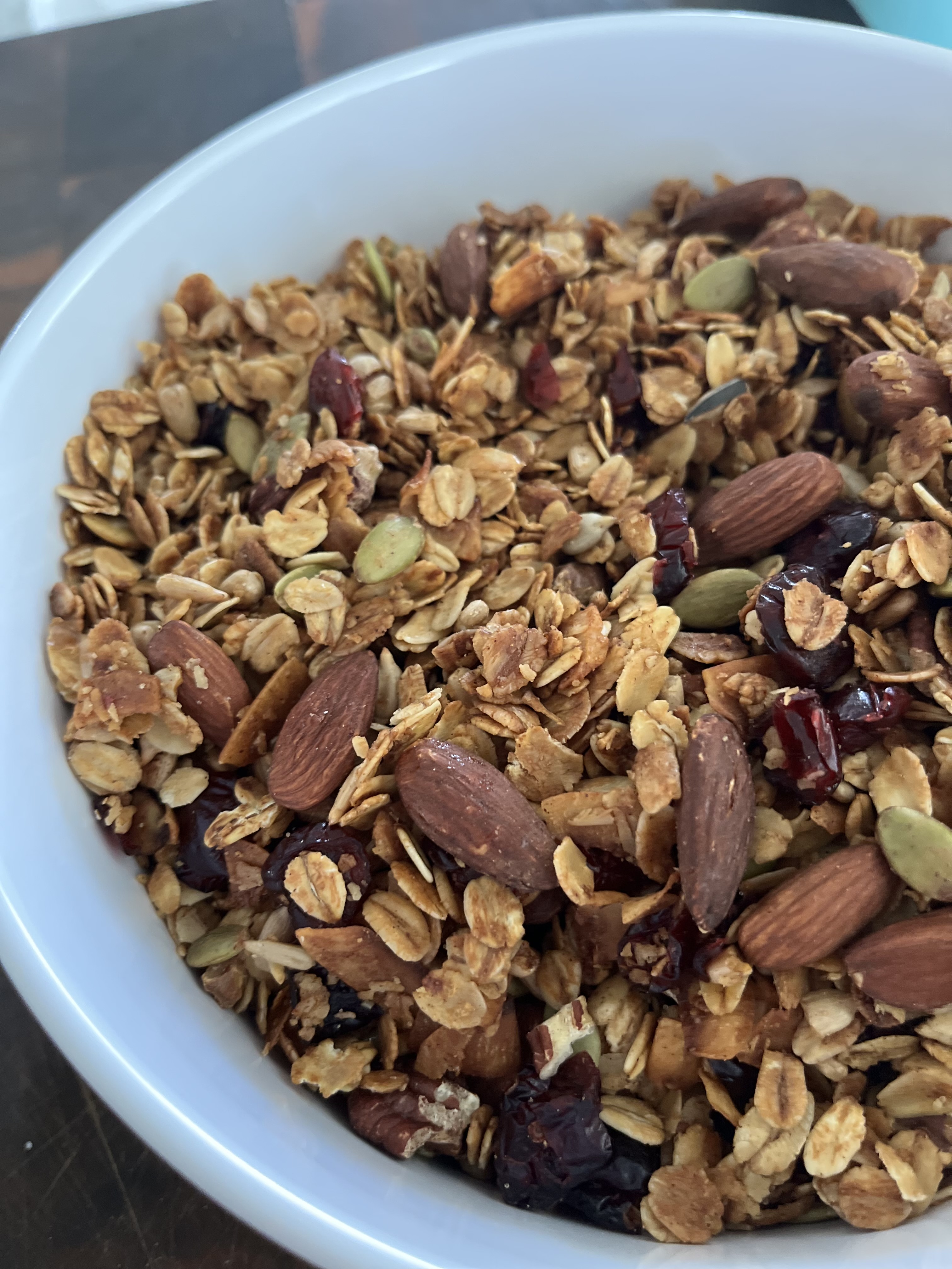 Transfer granola into a container and add dried fruit. Mix well.