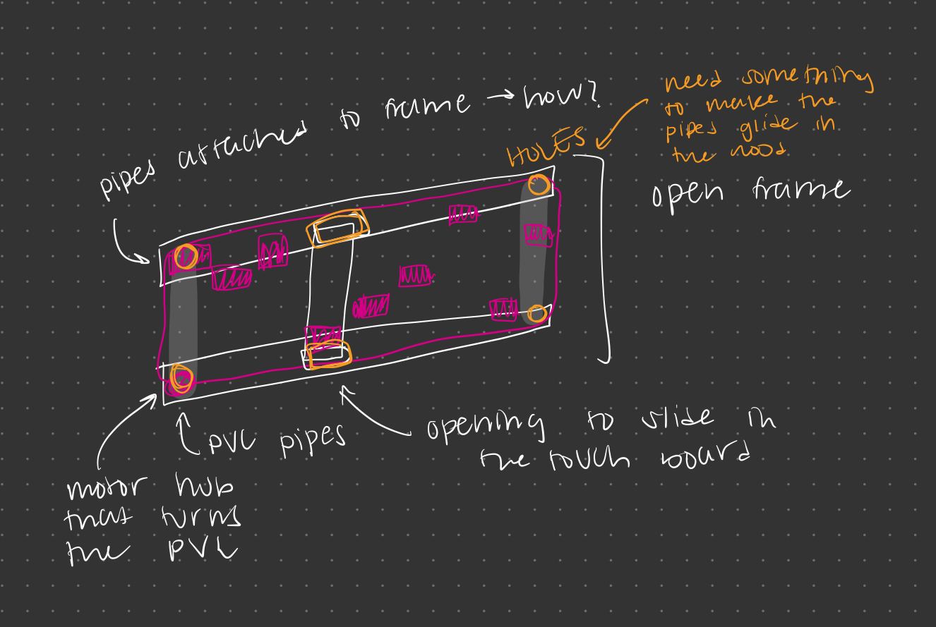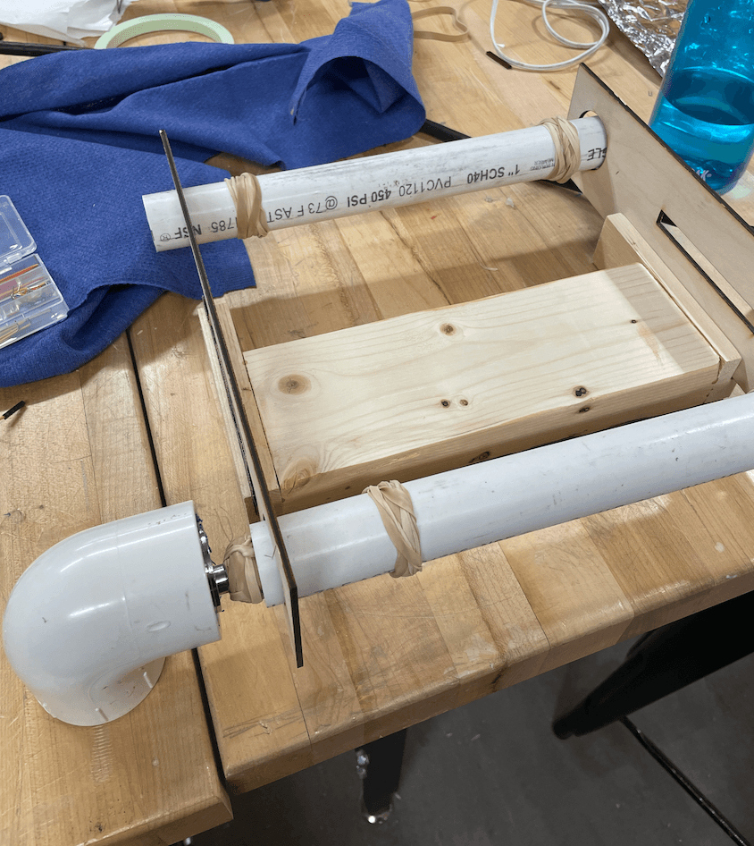 Created a wooden base with PVC pipe rollers and a laser cut frame. Used rubber bands to grip the conveyor belt. The extra PVC section held my motor and motor hub.