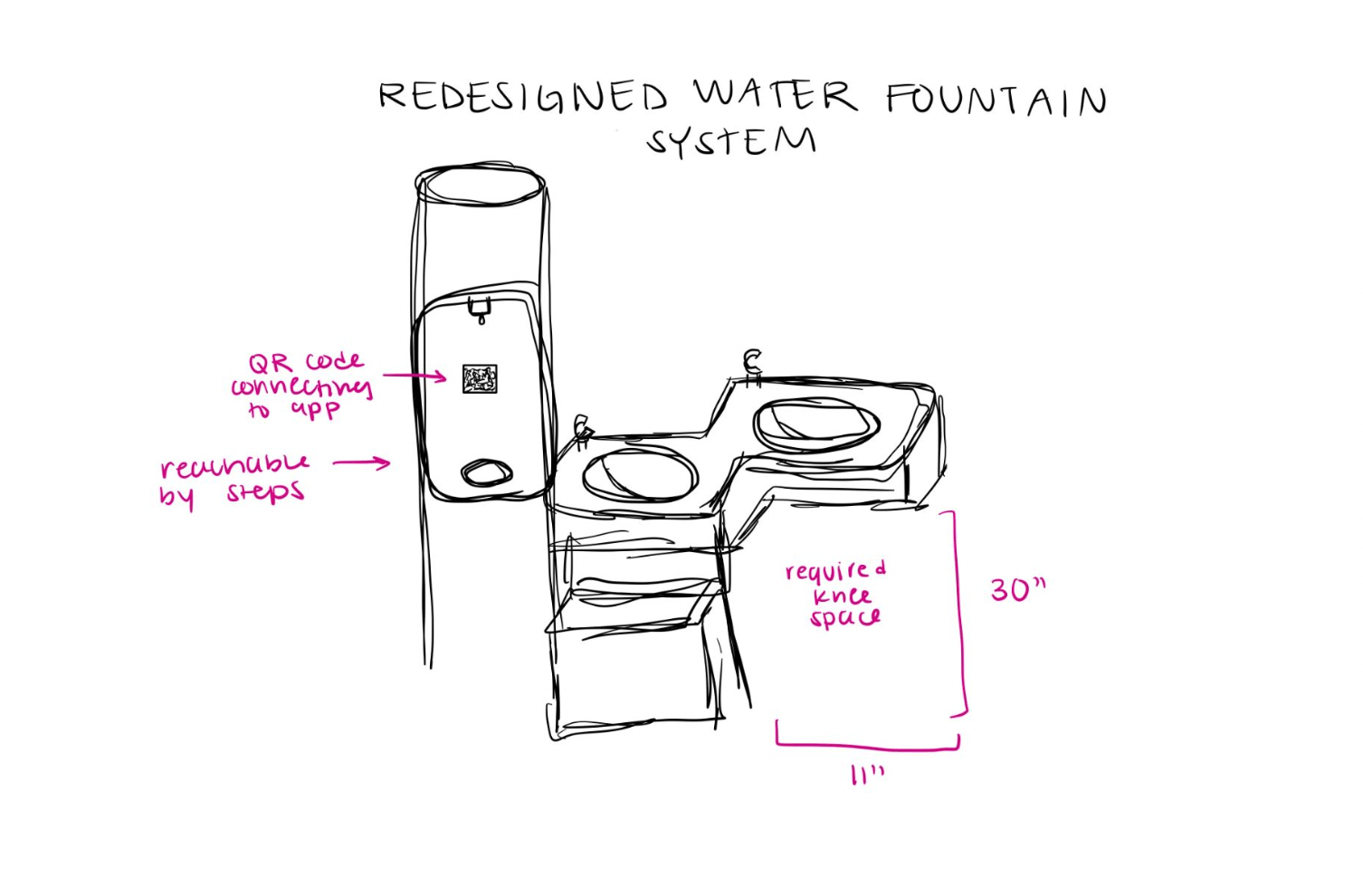 Our goal is to redesign public, outdoor drinking fountains. The current design is outdated and fails to accommodate for small children (ages 3-7 years old) and their parents. The product will feature a step ladder under the fountain so children of all heights can easily reach the drinking spout. Our design will also consider parents and taller individuals who may have to hunch over to drink from a water fountain. An adjustable tipping spout will allow the water stream to reach greater heights, eliminating the need to bend over. It will also have a water bottle filling station. Along with the physical product, we will design an app that maps all the closest water fountains and tracks water intake.