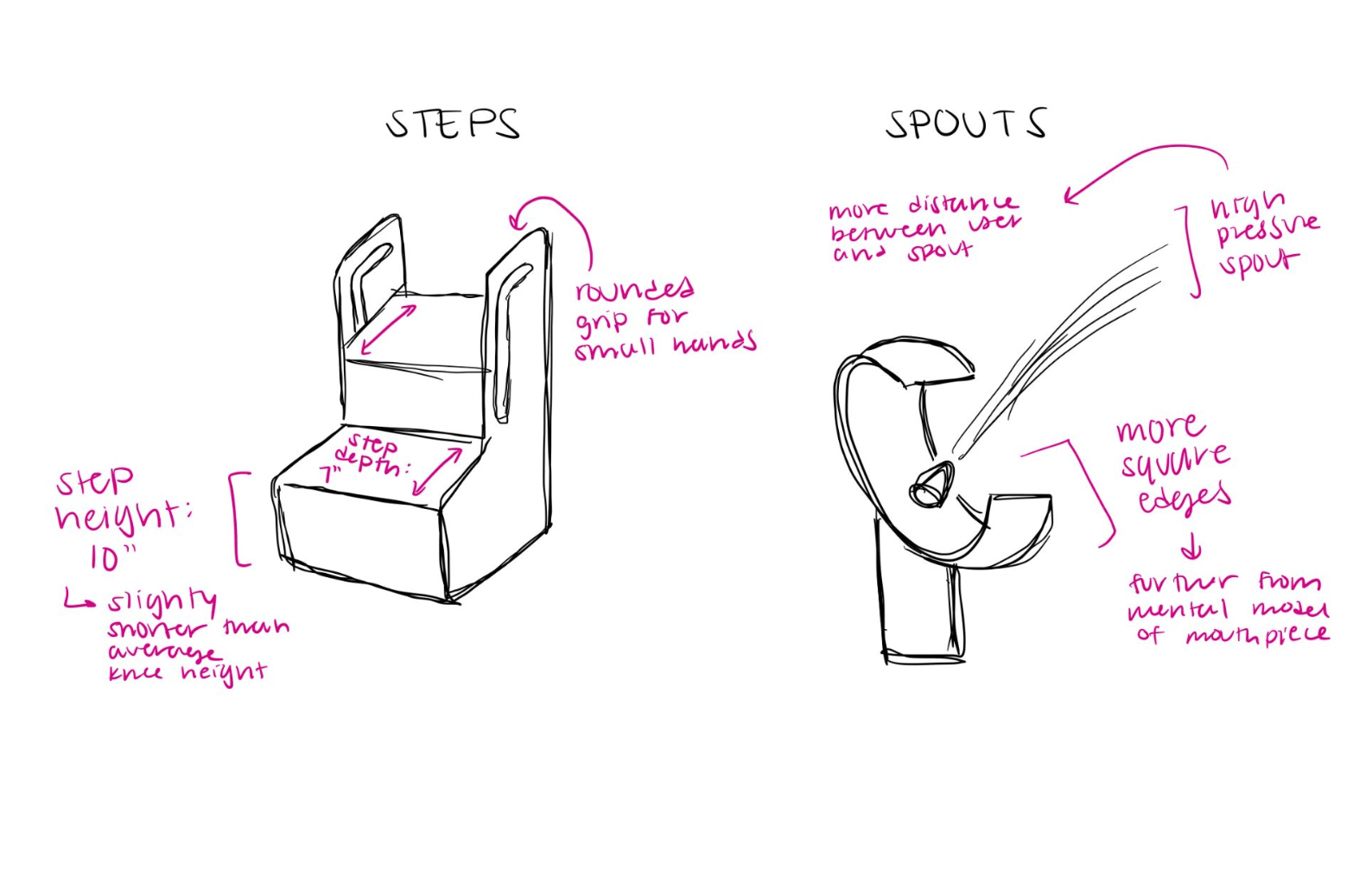 However, bacteria also spreads when the user touches their mouth to the water spouts. Current designs feature mouth guards that prevent the user from making contact with the spout. Children often think the mouth guard is a mouthpiece, like that of a water bottle. To combat this issue, we will design a mouth guard that strays further from that mental model. Additionally, our water stream will have a much higher arc to create more distance between the user and the spout.