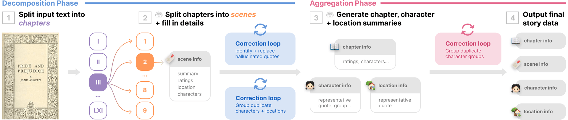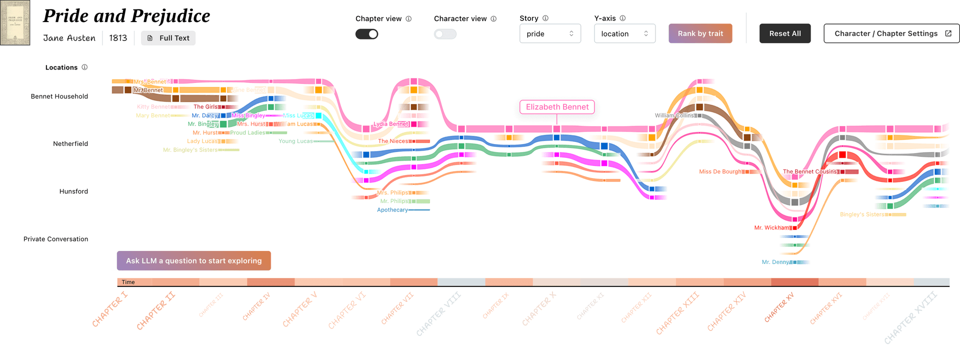 In collaboration with Catherine Yeh, Prof. Martin Wattenberg, and Prof. Fernanda Viégas in the Insight + Interaction Lab at Harvard, we built an LLM-driven data parsing pipeline and narrative (fiction/theater/film/poetry) visualization system, helping readers delve into the interactions between characters, locations, and themes and gain new insights about the story.
