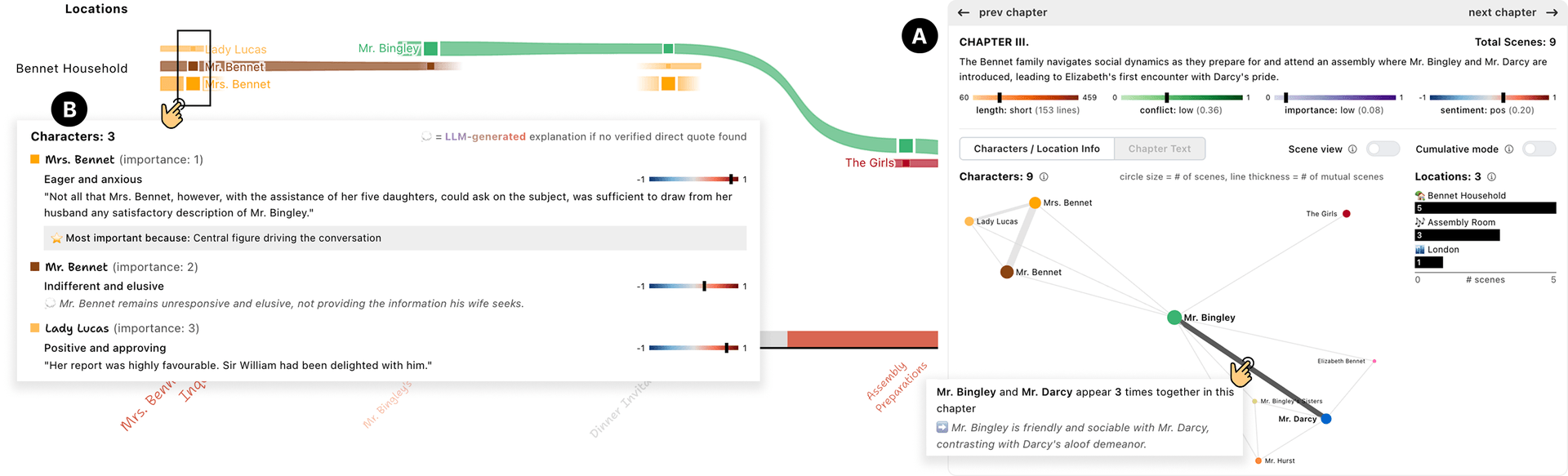 As a computer scientist, how do we visualize a 500-page novel on a 2D screen? As readers, how can we better keep track of interactions between characters, locations, and themes and gain new insights into familiar stories?