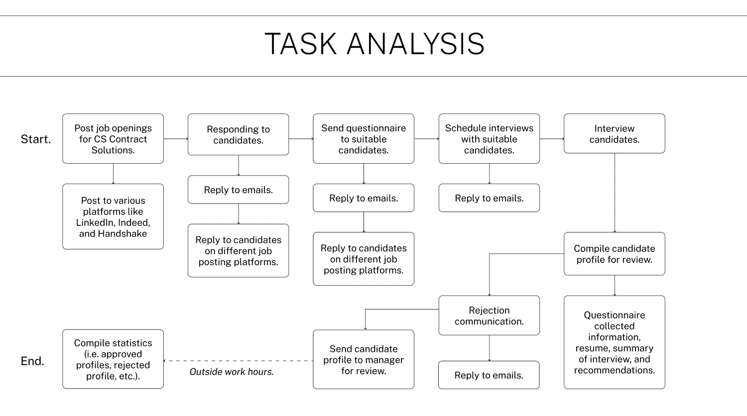In this project, I designed an automated system for a recruiter working at CS Contract Solutions [Telecommunications Services Vendor]. I began the design process by observing the recruiter and having her narrate to me the tasks that she’s engaging in. Following observation, I interviewed her about aspects that she enjoyed in her work and aspects that she wished she could change.