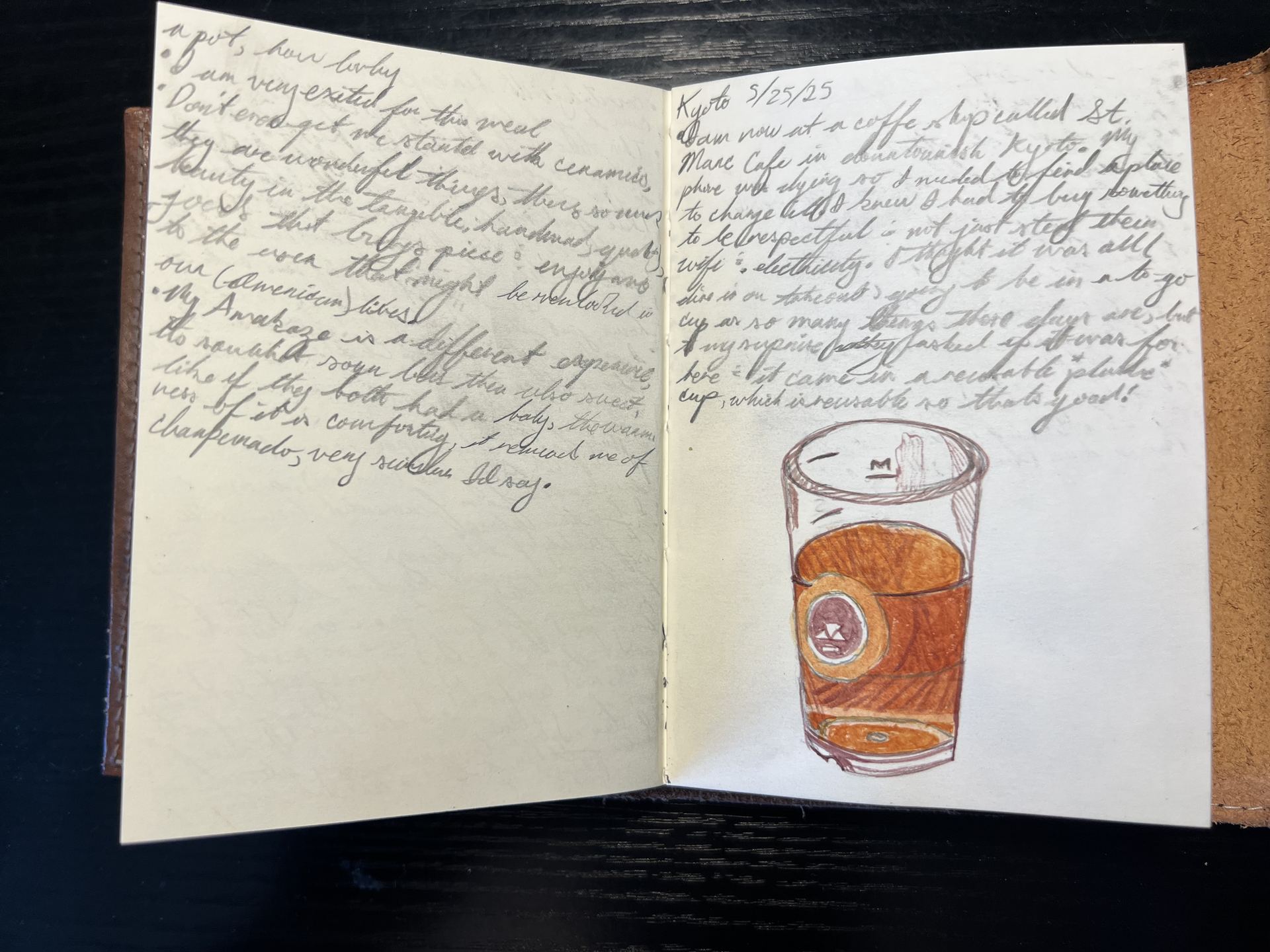 I am now at a coffee shop called St. Marc Cafe on the bustling street of Kawaramachi-dōri, the craziest commercial street I have seen in my life. My phone and portable charger were both on the verge of death so I stopped at htis cafe to charge them up. I knew I had to purchase something to be respectful to the cafe as I was goign to use their wifi and electricity. I had the perception that all dine-in and take-out would be in single-use disposables but to my surprise dine-in was in reusables. I ordered an iced tea and it came in a reusable plastic cup, so thats a plus!