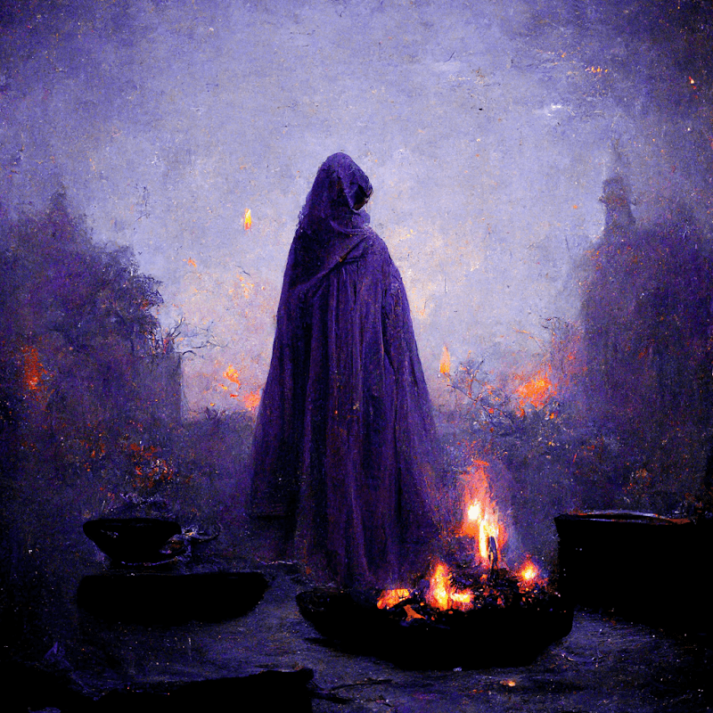 The flame pulsed purple again, brighter this time. Maurice stood at attention with his hand on the hilt of his blade. The flame pulsed again, remaining purple and glowing intensely. The kid could do nothing but stare as a lone, humanoid figure approached the light of the flame. He couldn’t make much detail, just a robe-like outline front-lit by the flame before it.